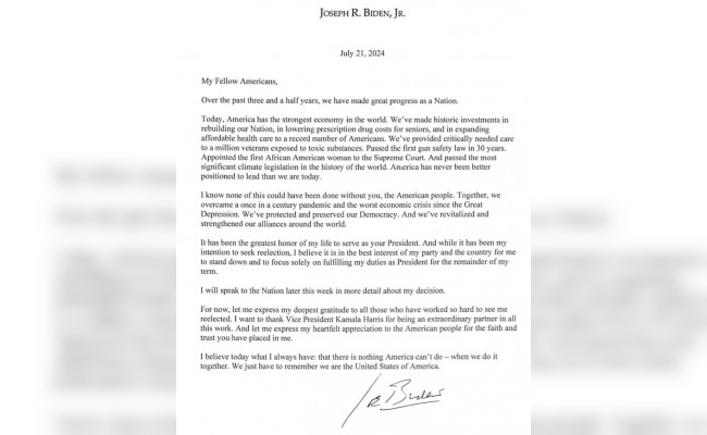 Además, el presidente anticipó que se dirigirá a la nación esta semana para dar más detalles de su decisión. En el texto también manifestó su apoyo a la vicepresidenta Kamala Harris. La candidata continúa en carrera para los comicios del 5 de noviembre.