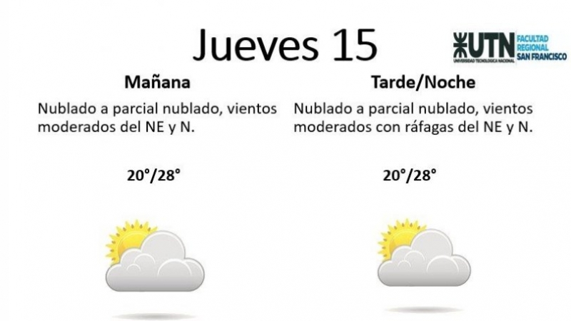 El jueves, por su parte, estará "nublado a parcial nublado, vientos moderados con ráfagas del NE y N". La temperatura mínima será de 20° y la máxima de 28°.