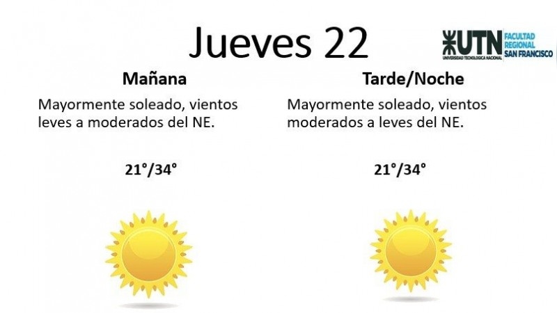 Según el pronóstico emitido por la Estación Meteorológica de la UTN San Francisco, se esperan jornadas calurosas durante los próximos días, con predominio del buen tiempo hacia el jueves.