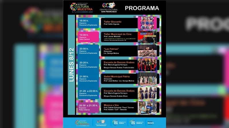 La Municipalidad de San Francisco, a través de la Dirección de Cultura, dependiente de la Secretaría de Gobierno llevará a cabo “Cultura Muestra”, los días 6, 7, y 8 de diciembre en el Centro Cultural San Francisco, ubicada en calle Mitre esq. J.J.Paso, de 17:00 a 22:30 hs.