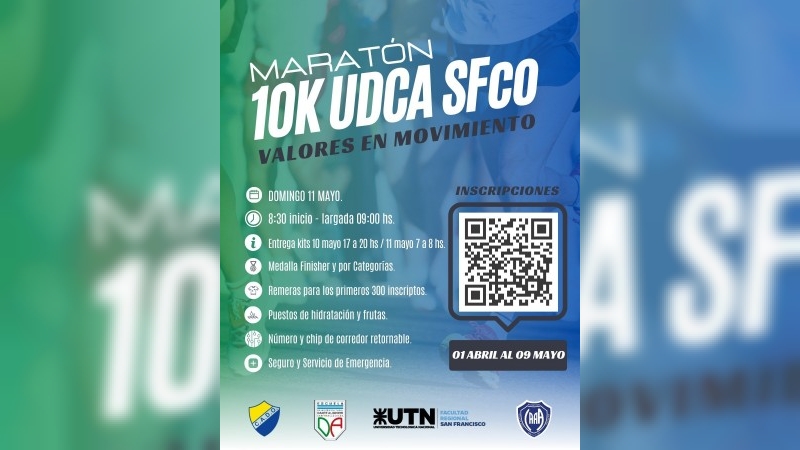 El próximo domingo 11 de mayo, nuestra Facultad Regional, junto a la Escuela Bilingüe Bicultural Dante Alighieri, el Club Atlético Deportivo Oeste y el Club Atlético Antártida Argentina, llevarán a cabo la Maratón 10K UDCA SFco 2025, un evento deportivo que busca promover los valores de la actividad física, la integración y el espíritu de comunidad, bajo el lema "Valores en Movimiento".