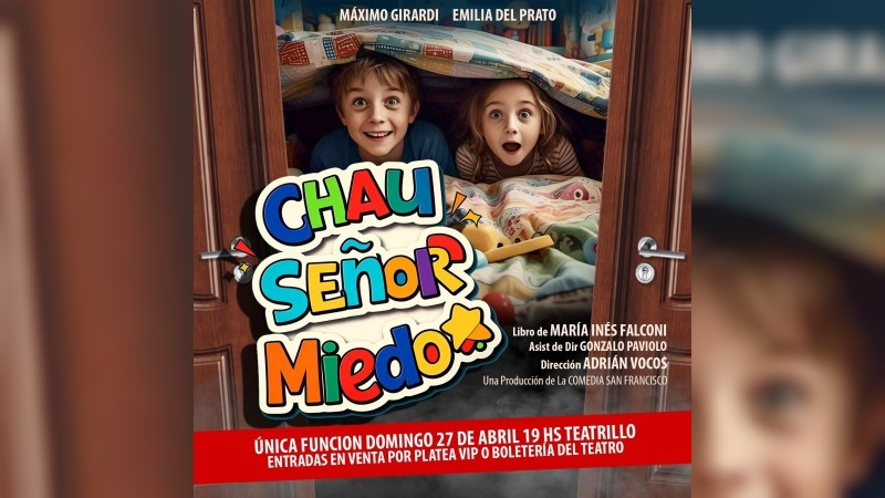 Con libro de María Inés Falconi estrena en el Teatrillo esta obra para disfrutar en familia. Graciela no puede dormir porque le teme a los fantasmas, a los ruidos extraños y a la oscuridad. Pero en una noche temblorosa, junto a su hermano Carlos, aprenderá a superar sus miedos y a despedirse de ellos. Una divertida obra de teatro sobre los miedos y la forma de superarlos. Una historia emocionante, llena de aventuras y enseñanzas, que hará reír y reflexionar a grandes y chicos. Producción de la Comedia San Francisco, dirección de Adrian Vocos, asistente de dirección Gonzalo Paviolo. Elenco: Maximo Girardi y Emilia del Prato. UNICA FUNCION.