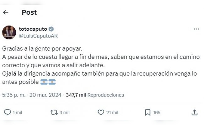 El ministro de Economía, Luis “Toto” Caputo, agradeció hoy a la sociedad por el apoyo a la gestión pese a “lo que cuesta llegar a fin de mes”. A su vez, se mostró convencido de que las medidas van en sentido hacia un “camino correcto”.