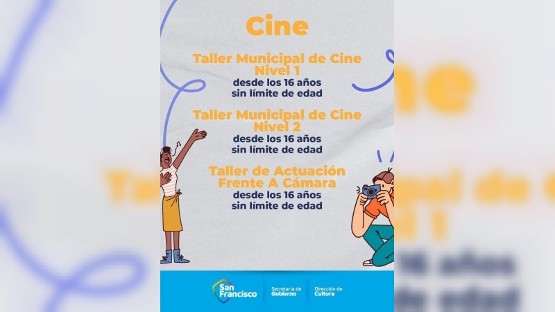 Taller Municipal de Cine Nivel 1 (desde los 16 años sin límite de edad); Taller Municipal de Cine Nivel 2 (desde los 16 años sin límite de edad); Taller de Actuación Frente a Cámara (desde los 16 años sin límite de edad).