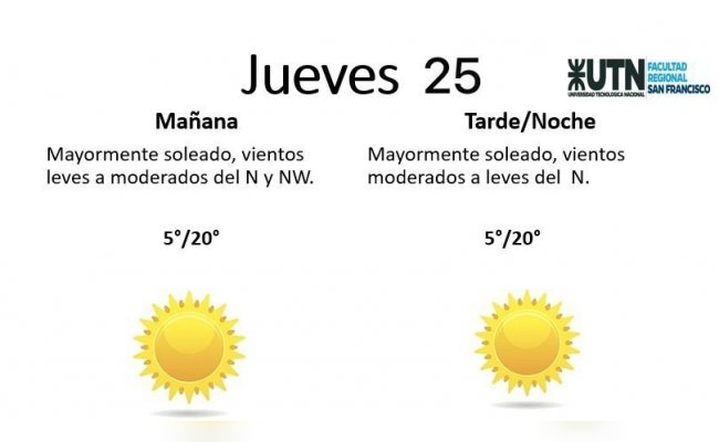 El jueves, por su parte, estará "mayormente soleado, con vientos leves a moderados del N y NW". La temperatura mínima es de 5° y la máxima de 20°.