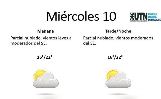 Miércoles 10, por la mañana, el cielo estará parcialmente nublado, con vientos leves a moderados del sureste. Con una mínima de 16 y una máxima de 22 grados. El clima se mantendrá igual para la tarde/noche.