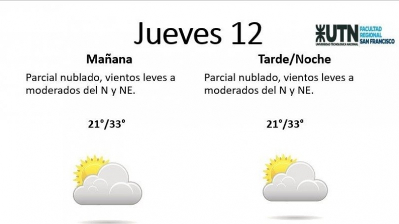 El jueves, por su parte, estará "parcial nublado por la tarde, con vientos leves a moderados del N y NE". La temperatura mínima es de 21° y la máxima de 33°.