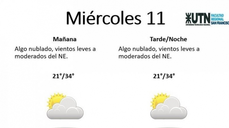 El miércoles se presentará "algo nublado, con vientos leves a moderados del NE". La mínima pronosticada es de 21° y la máxima de 34°.