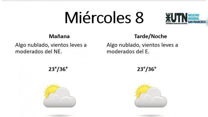 El miércoles se presentará "algo nublado, con vientos leves a moderados del NE y por la tarde los vientos serán del E". La mínima pronosticada es de 23° y la máxima de 36°.