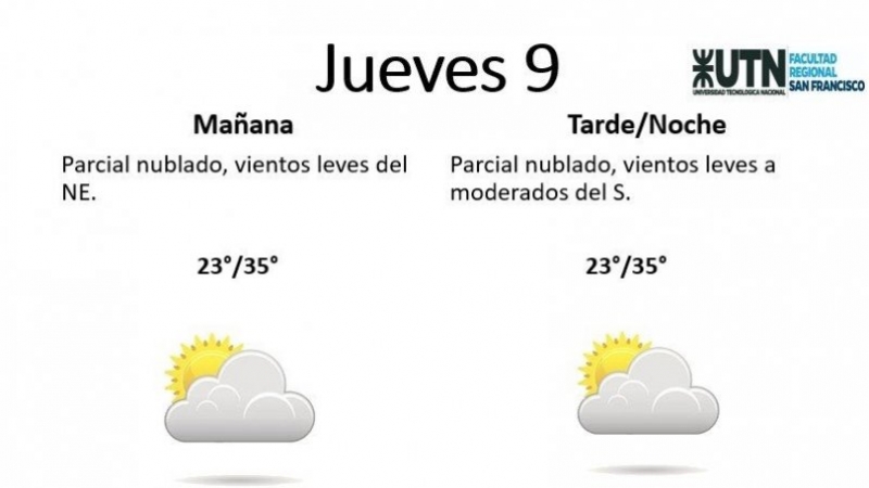 El jueves, por su parte, estará "parcial nublado, con vientos leves del NE y por la tarde vientos leves a moderados del S". La temperatura mínima es de 23° y la máxima de 35°.