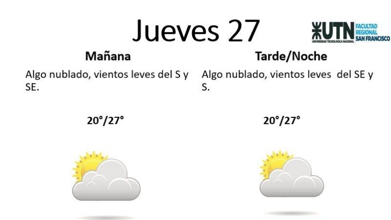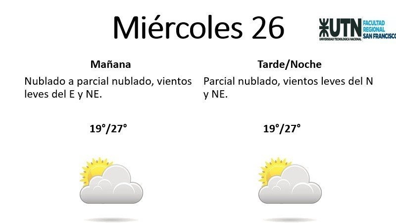 El miércoles se presentará "nublado a parcial nublado, con vientos leves del E por la mañana, rotando al N y NE por la tarde". La mínima pronosticada es de 19° y la máxima de 27°.