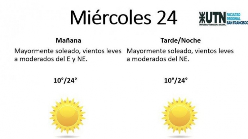 El miércoles se presentará "mayormente soleado, con vientos leves a moderados del NE". La mínima pronosticada es de 10° y la máxima de 24°.