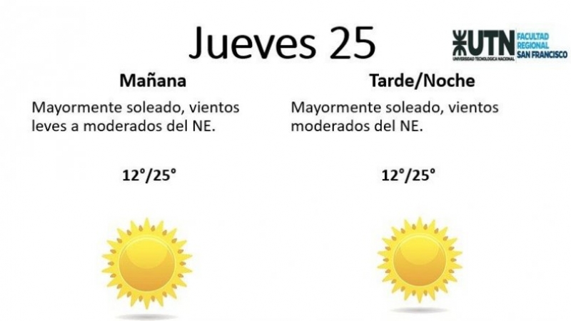 El jueves, por su parte, estará "mayormente soleado, con vientos leves a moderados del NE". La temperatura mínima es de 12° y la máxima de 25°.