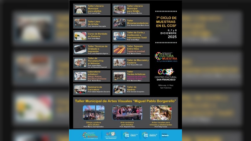 La Municipalidad de San Francisco, a través de la Dirección de Cultura, dependiente de la Secretaría de Gobierno llevará a cabo “Cultura Muestra”, los días 6, 7, y 8 de diciembre en el Centro Cultural San Francisco, ubicada en calle Mitre esq. J.J.Paso, de 17:00 a 22:30 hs.