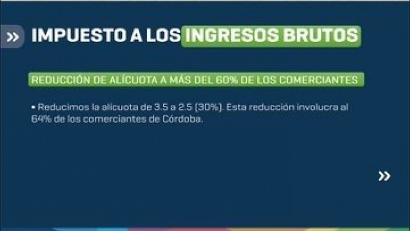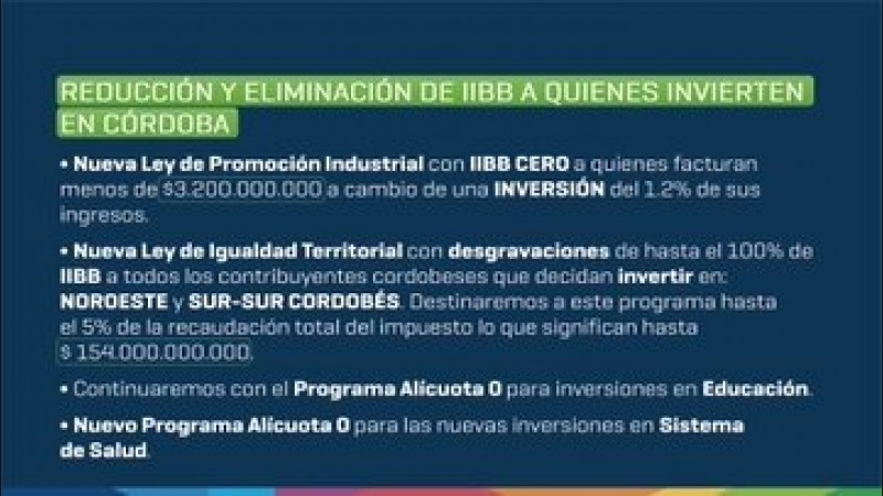 En esa línea, informó que se presentó ante la Legislatura de Córdoba el Presupuesto 2026, que incorpora un importante Plan de Reducción Impositiva orientado a aliviar la carga fiscal y promover la producción. Según los detalles difundidos, más del 60% de los comerciantes se verán beneficiados con la disminución de la alícuota de Ingresos Brutos, que baja del 3,5% al 2,5%. Además, el plan contempla la eliminación o reducción del impuesto para quienes inviertan en la provincia, con iniciativas específicas para la industria, la igualdad territorial, la producción agrícola, los créditos hipotecarios, la economía del conocimiento y emprendimientos apoyados por el Fondo Emprendedor Córdoba.