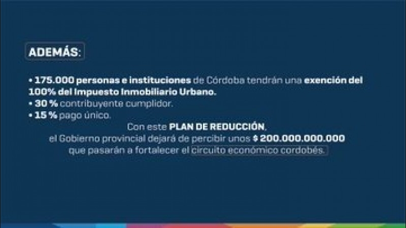 - 175.000 personas e instituciones de Córdoba tendrán una exención del 100% del Impuesto Inmobiliario Urbano.