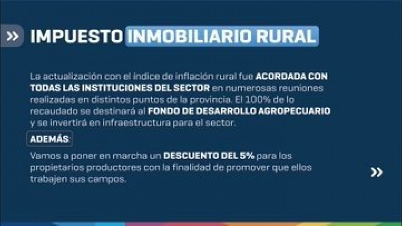 En este anuncio, el gobernador comenta que la actualización con el índice de inflación rural fue acordada con todas las instituciones del sector en numerosas reuniones realizadas en distintos puntos de la provincia. El 100% de los recaudado se destinará al Fondo de Desarrollo Agropecuario y se invertirá en infraestructura para el sector.