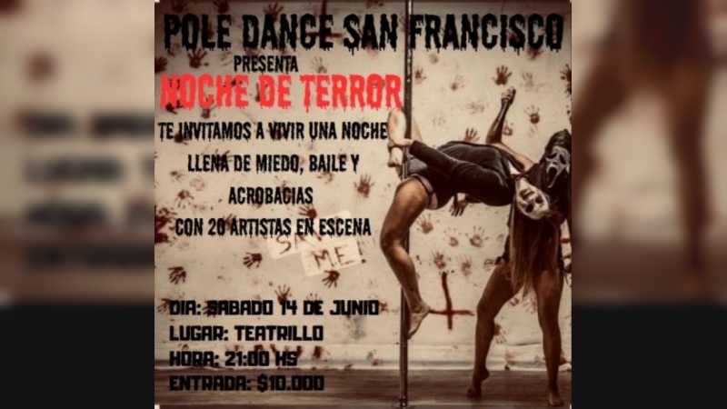 Un espectáculo impactante de Pole Dance, de la mano de los profesores Cris Anchino y Luis Marchese. Una puesta en escena impactante, los bailarines se lucirán con caracterizaciones aterradoras que te harán temblar de miedo. Los artistas son: Helena Gino, Pilar Pautasso, Lucas Carrizo, Emma Pesce, Guadalupe Jasson, Giuliana Chavez, Alma Heil, Rosa Cabrera, Carolina Juarez , Luciana Machado, Daniela Musso, Támara Molina, Natali Gonzalez , Ivana Chiabarando y Virginia Peirone.