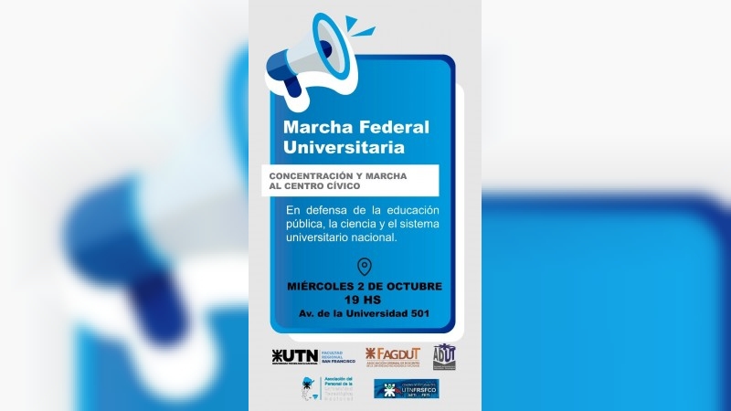 El viernes 27 de septiembre el interclaustro intergremial de San Francisco mantuvo una reunión en la que se acordó adherir a la convocatoria del Consejo Interuniversitario Nacional y el Frente Sindical de Universidades Nacionales, a la Marcha Federal Universitaria a realizarse el miércoles 2 de octubre a las 19 horas.