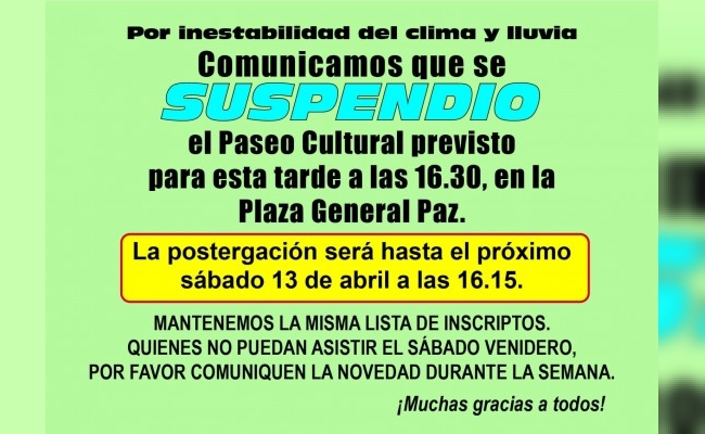 Por la lluvia, se suspendió el Paseo Cultural del AGM